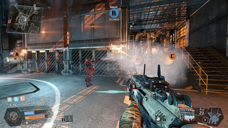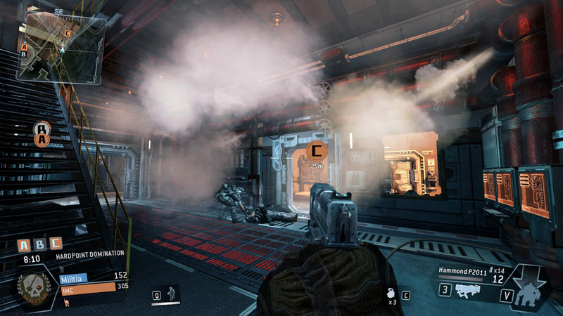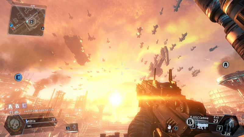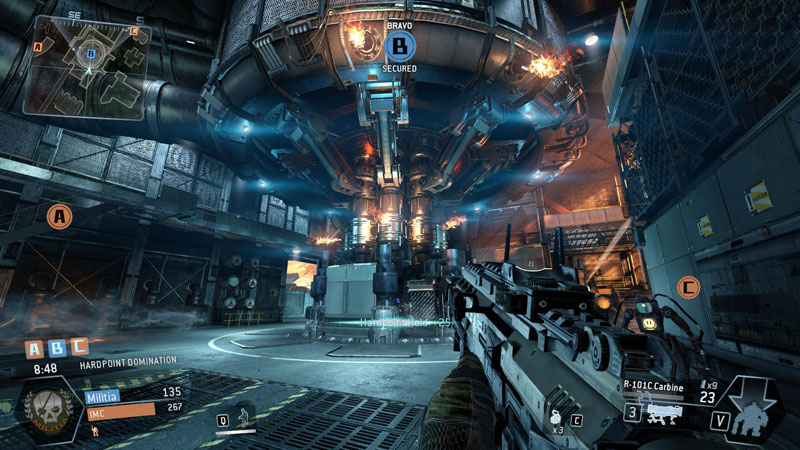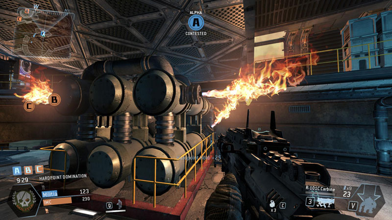 My work primarily consisted of scripting the sky battle, firefighter robots, FX, SFX, screen shake, dialogue, etc. when either team took a hardpoint. The Militia were trying to cause a reactor meltdown so when they controlled a hardpoint, it would overload with fire and rumbling. When the IMC, who were trying to prevent a meltdown, controlled a hardpoint, it would be cooling off with steam.